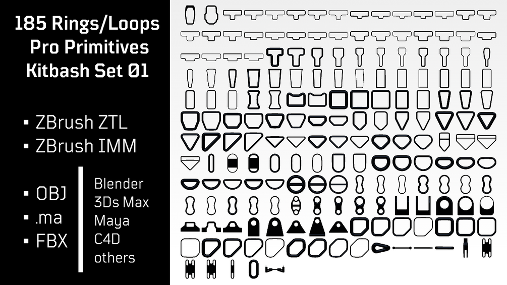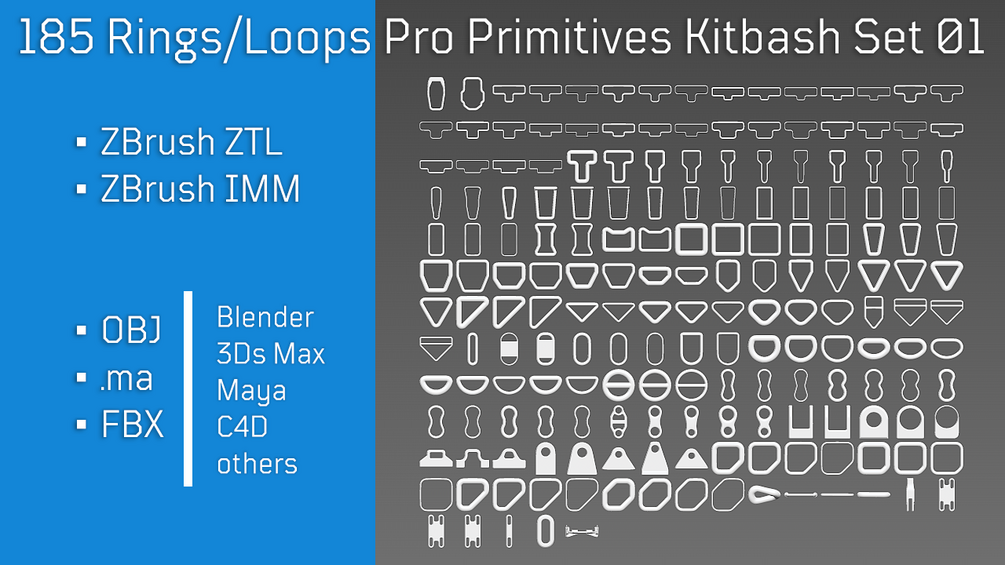 You will get 185 Ring and Loop Primitive kitbash parts in ZTL and ZPB files for both ZBrush 2022 and 2025. You will also get FBX and OBJ files for other apps like Blender, Maya, Max and all DCCs that accept .obj and .fbx files