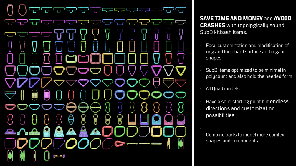 This kit includes 185 SuBD, topologically all quad, symmetric ring and loop form variations in multiple thicknesses and angles. The parts are SubD and hold their intended form with Dynamic or Catmull Clark subdivision. The meshes are designed to be easily manipulated with deformers, modeling and sculpting tools, giving you the flexibility to refine and customize them to fit your unique vision. This is the second of my personal collection of kitbash kits that I have modeled over time and used on commercial and personal projects. More kits will be available pending the success and commercial viability of the this and subsequent kits.